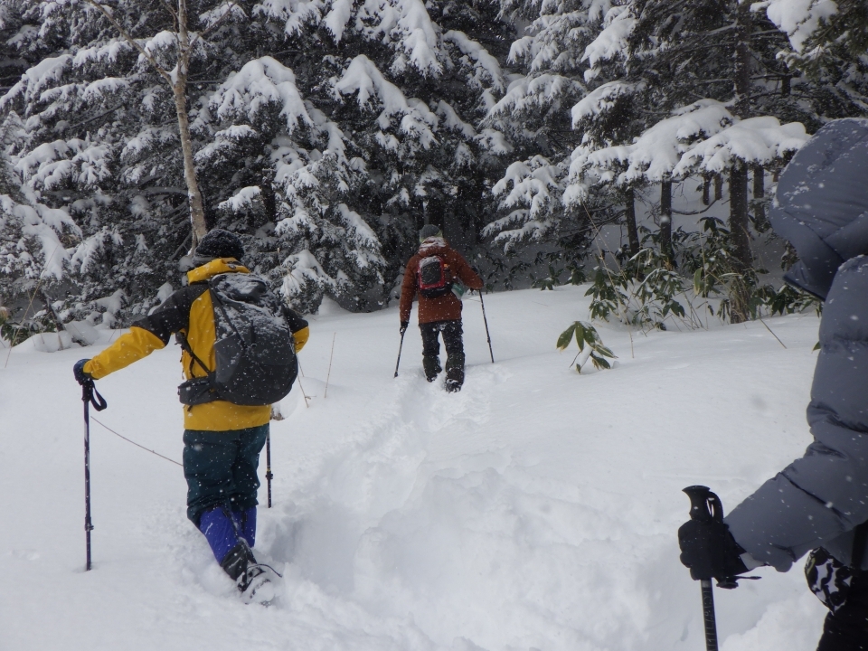 スノーシューの魅力は、雪がないときには歩けないところを歩けることです。雪があれば自由に歩けるので、決まった道を歩くのとは違った楽しさがあります。