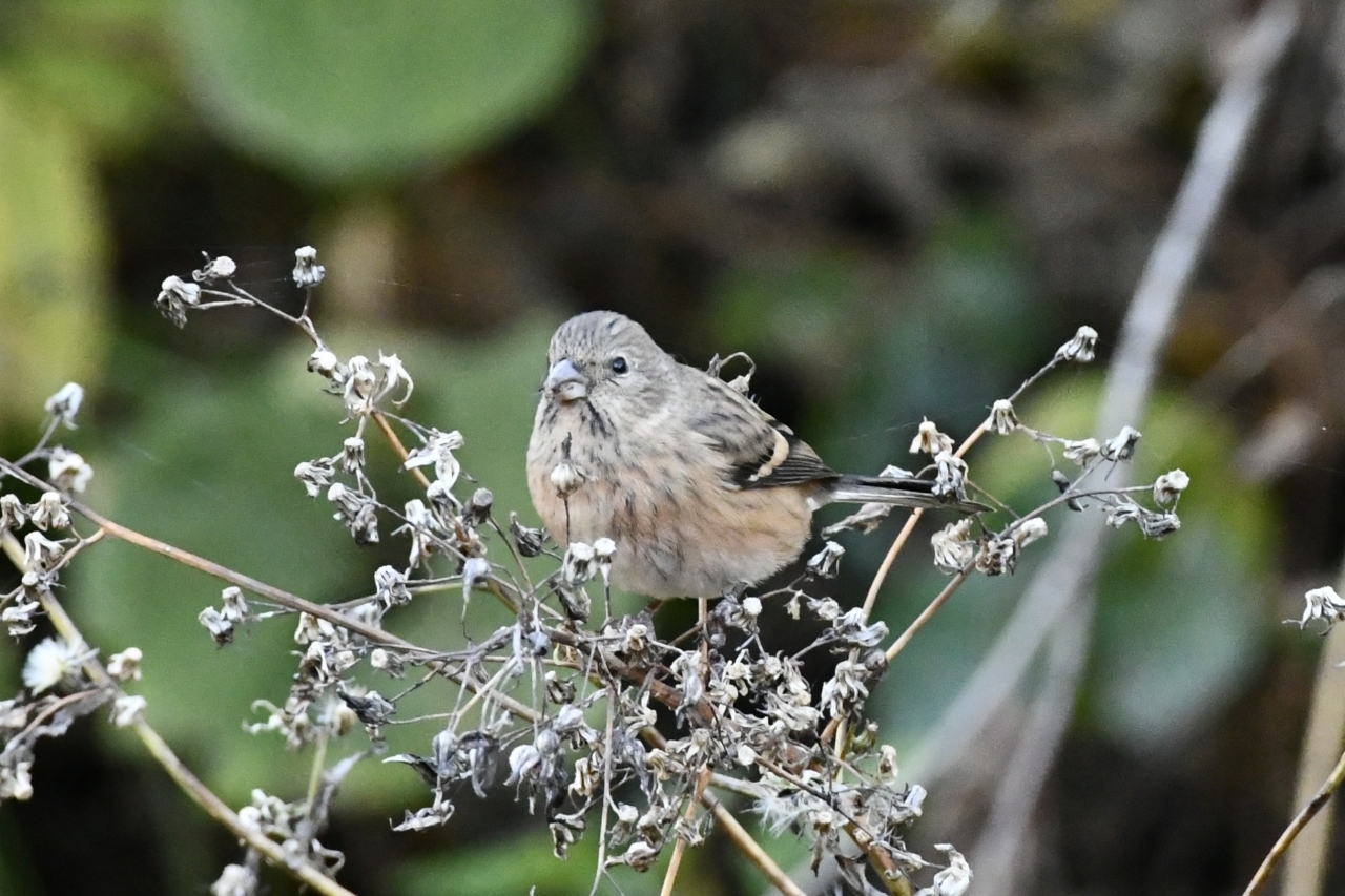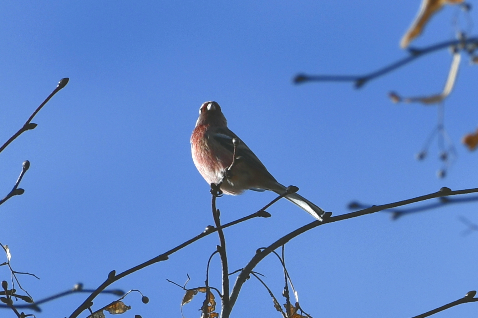 近頃、いもり池の周りで弾むような「ピッポ、ピッポ」という鳴き声が聴こえてきませんか?その声の主はベニマシコ。夏は北海道や青森県で繁殖期を過ごし、冬鳥としてやってきています。雄はお猿さんの顔のように赤い色をした鳥で、大きさは15㎝くらい。一方雌は赤い部分がなく、ちょっと地味。翼にある太い2本の白帯で他の小鳥と見分けがつきます。ヤブを飛び回っていますが、食べている時(草の種が好き)は比較的じっとしているので観察しやすいですよ。