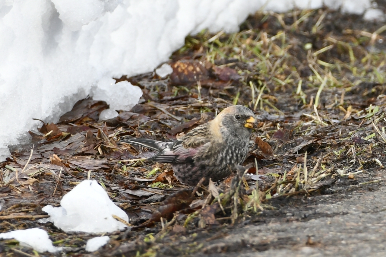 この頃暖かくなったとはいえ、この付近では地面が露出しているところは除雪された道路の脇くらい。車の往来のたびに逃げたり、戻ったり、積雪地のえさ場探しは苦労がありそうです。