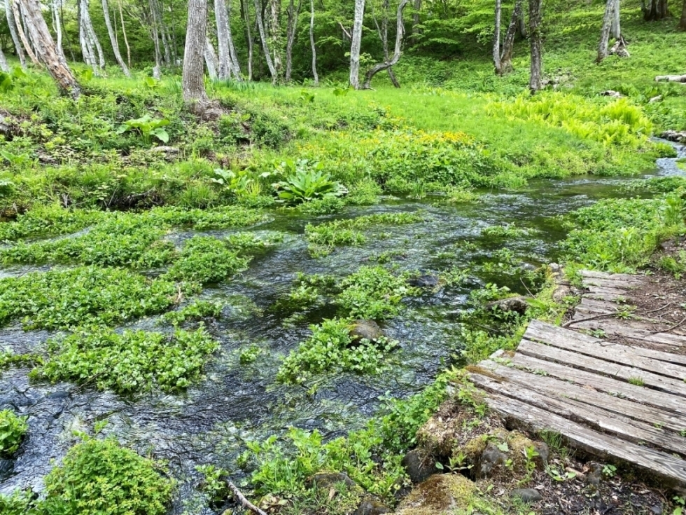 宇棚の清水ではリュウキンカが見頃。清水ヶ池付近のレンゲツツジはつぼみ、キンポウゲは咲き始めです。