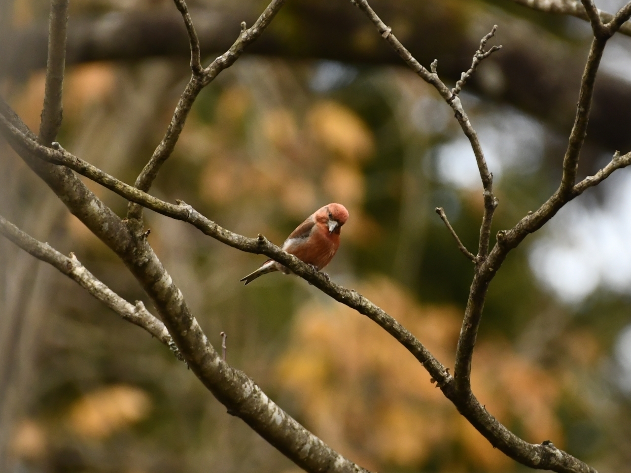葉が落ち始めた森の中、冬鳥や漂鳥を楽しめる季節になってきました。今、いもり池周辺では山の上から標高を下げてきたウソや、ピッポの鳴き声がかわいいベニマシコなど夏とは違った鳥たちが見られます。そしてちょっとめずらしいあの鳥も。肌寒くなってきたので、羽織ものを忘れずにお出かけください。
