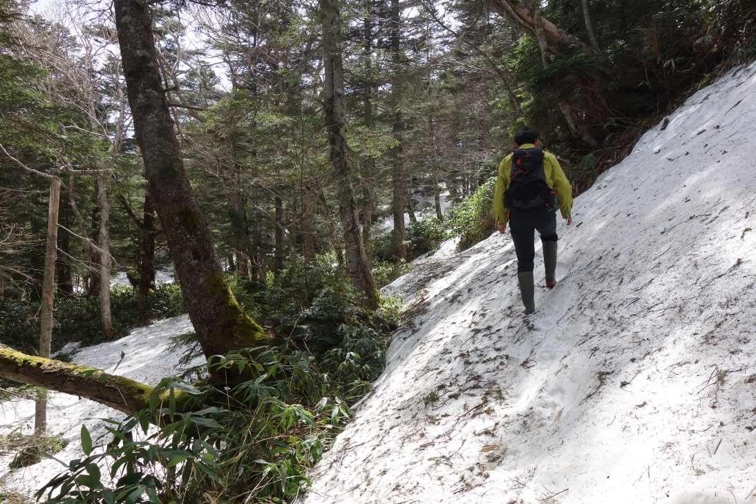 硯川から四十八池湿原までの道は雪が残っている区間があります。四十八池湿原に向かって標高が上がっているので、四十八池湿原に近づくにつれて残雪が多くなります。残雪の状況を考えると一般の方がトレッキングで歩くことはまだ難しいと感じました。