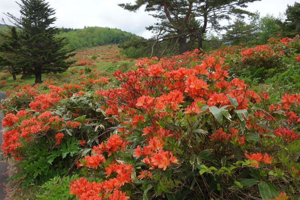 下の写真は自然園内でレンゲツツジの群生を見られる場所の一つ「つつじハウス周辺」です。駐車場の近くにあるので散策しやすいです。ここの標高は約1,630mです。