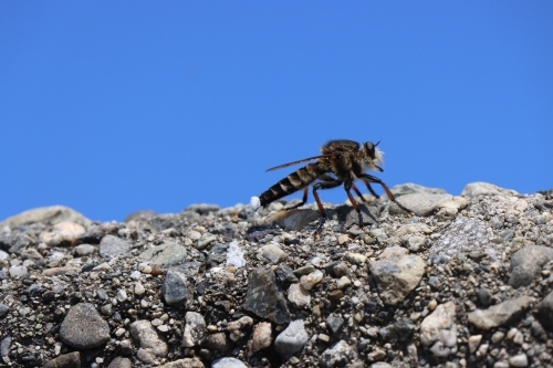 海岸を歩いていると、ハイスピードで飛び回る一匹の強者を発見。青空を背景に動じる様子はありません。ファインダー越しに反撃を試みるも空しく敗退!
