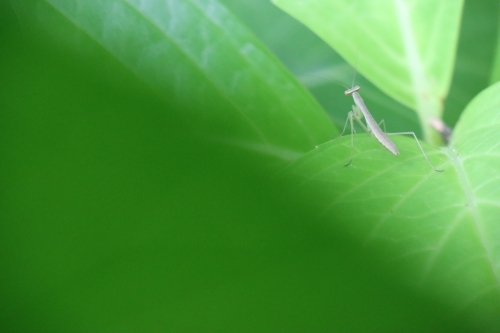 アジサイの葉には小さなカマキリが警戒中。このおチビちゃんには今の時期にしか出会えませんよね。