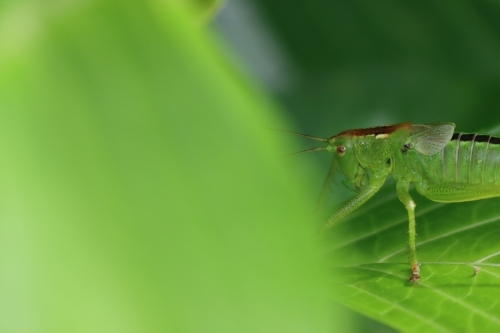 羽が小さいところを見ると、このキリギリスもまだ成虫ではなさそうですね。緑の色合いがとてもきれいですね。