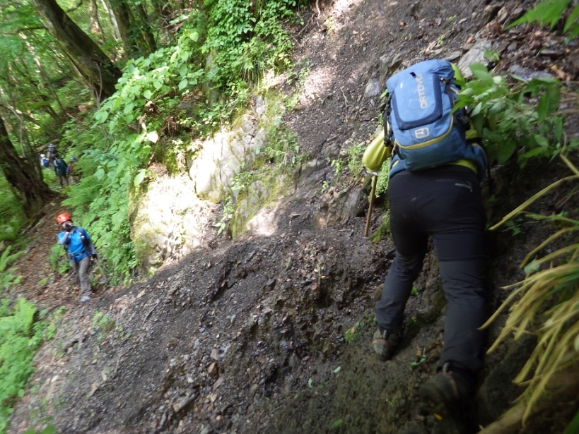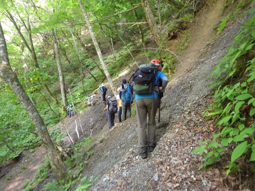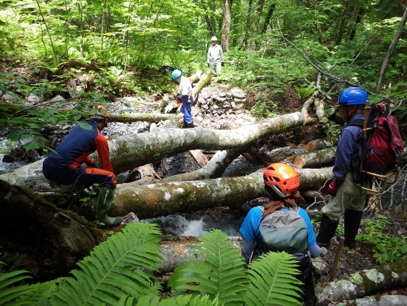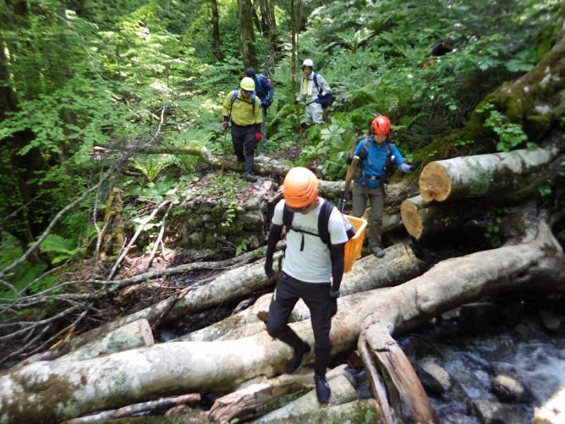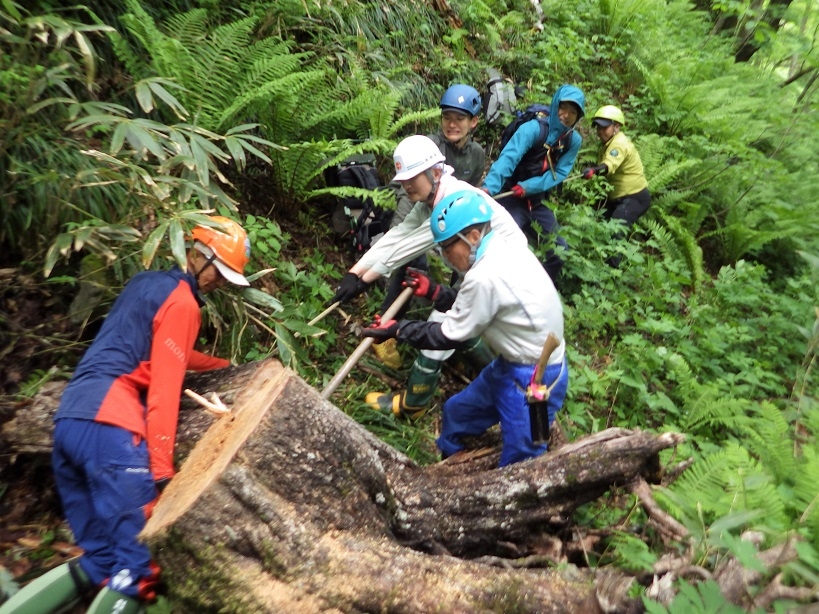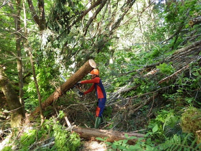 通行止めとなって以降、関係機関で調査や復旧工事を行い、昨年の復旧状況で通行止め解除に一定の目処が立たったことから、今年度は開通に向けた準備作業として、6月5日に「古道徳本峠道を守る人々」、長野県、松本市、自然公園財団とともに登山道整備を行いました。昨年から1年を経て登山道には新たな倒木や崩壊地が多々あり、整備を行ったものの、まだまだ対応が必要な箇所が確認されました。引き続き関係者と協力して、早期開通に向けて対策を進めていきたいと思います。