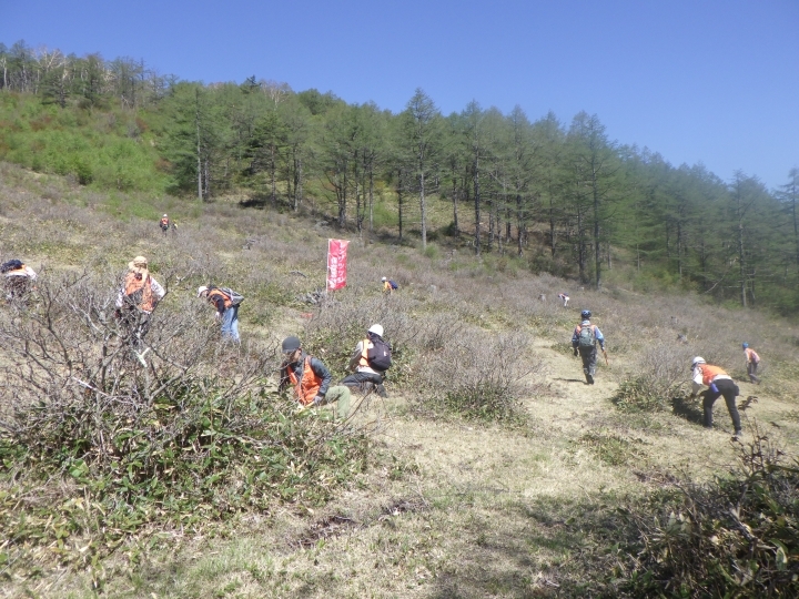 牧場としての役割は終わりましたが、湯の丸牧場運営協議会により牛の放牧は継続されることになりました。放牧される数は20頭から30頭ほどで最盛期に比べると10分の1程度で、牛の力だけではレンゲツツジを守るのは難しく、今では人の手も使った保全活動が年に3回ほど行われています。