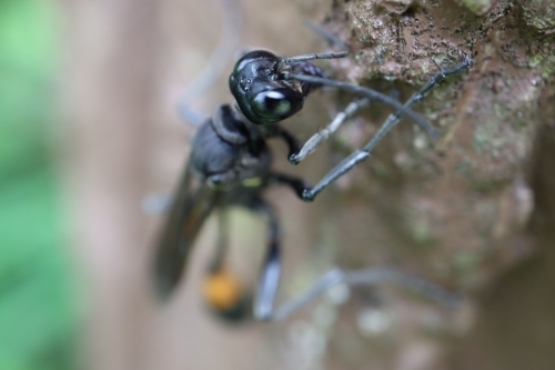 土に穴を掘って巣を作る蜂です。近寄るとブンブン羽音を鳴らしていますが、刺激してしまうと刺す可能性があるそうです。