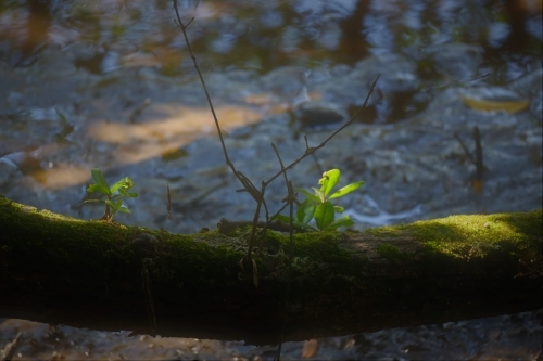 湿地には苔生える枝木が横たわっています。足音を感じると、湿地に残された水たまりから「キーッ、キーッ」と激しく鳴くカエルの声が不気味に響きます。静寂を打ち破るその声に、一瞬身構えてしまいます。