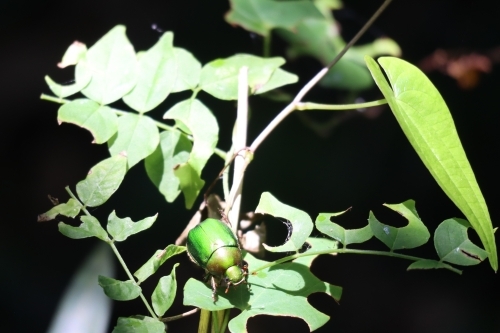 暗がりでは、スポットライトを浴びるようにコガネムシが食事中です。グリーンメタリックな色合いが、自然の不思議さを教えてくれます。