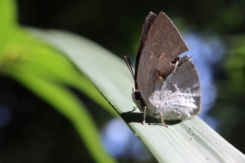 羽を休めているのはウラギンシジミです。成虫は5月から10月に見られ、この間に2,3回発生するそうです。この子は羽も破れ、もうすぐその命を終わろうとしているのかもしれません。見つめる先は何なのか。少し寂しい気持ちになりました。
