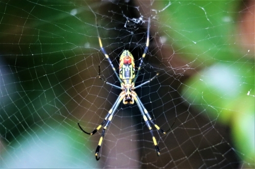 大池で番人のような存在なのがジョロウグモです。大池のあちこちで不審者の見張りをしてくれています。クモ目ジョロウグモ科ジョロウグモ属に属するクモで、夏から秋にかけて大きな網を張ります。視覚があまりよくなく、獲物が巣のどこかでかかったのを巣の糸を時々足で振動させて、そのエコー振動で感じ取るそうです。
