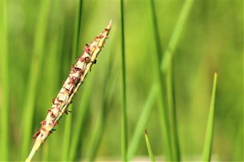 タイワンカモノハシは、湿地にわずかに姿が見られます。ものすごく地味ですが、大変貴重な植物です。高さ30~80㎝のイネ科の多年草で、カモノハシの母種に当たります。三重県内での確実な産地は大池のみとのことです。