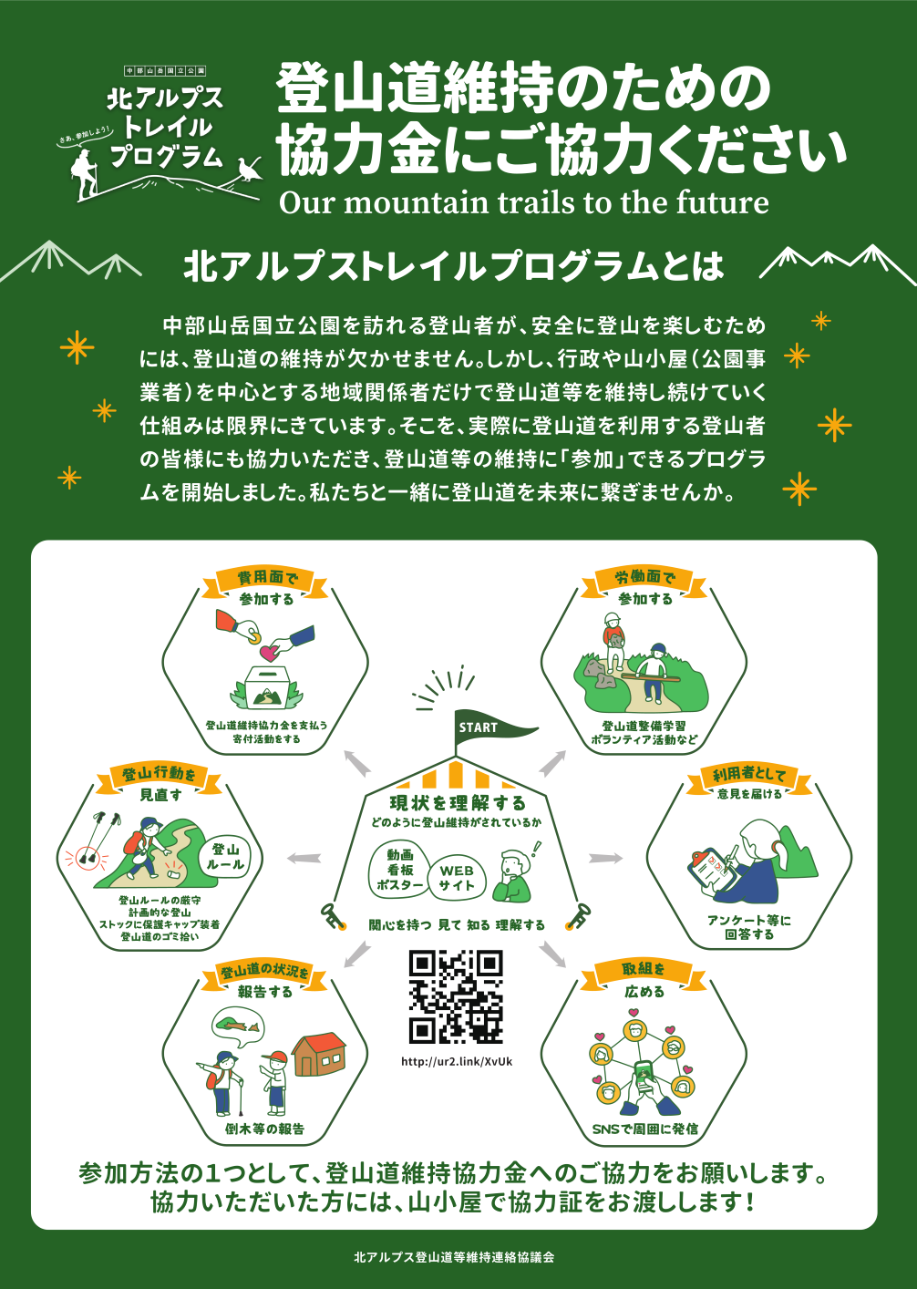 「北アルプストレイルプログラム」は、さまざまな形で登山者の方に協力して頂くことの出来る取り組みです。