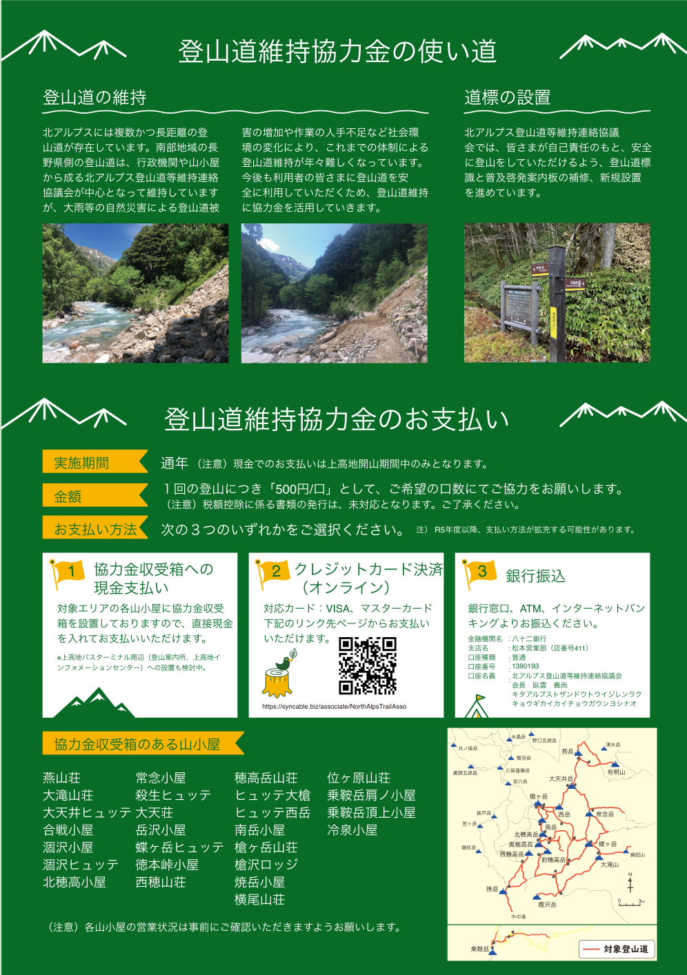 募金して頂いた登山維持協力金は、北アルプスの登山道維持のために使用されます。
