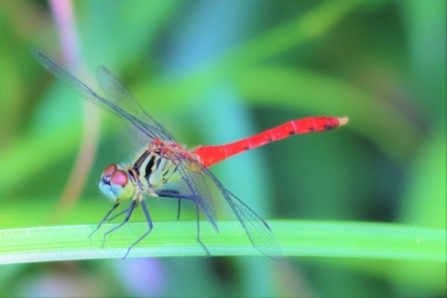 台風後の湿地に足を向けると、水位もかなり元に戻り、トンボや草花にも活気が感じられるようになっていました。静かに先へ進んで行くと、見慣れない赤トンボが一匹休んでいたので、思わずシャッターを切りました。小さくてとてもきれいです。調べてみるとマイコアカネのオスでしたが、全国的にもとても貴重なトンボらしく、今日はこの子に出会えただけで満足です!