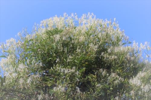 あちこちに目をやると、センニンソウの花が元気に咲いています。キンポウゲ科の植物で、茎や葉の切断面から出る汁や濡れた花粉に触れると炎症を起こす有毒植物です。見られたときには、触れずに観察しましょう。