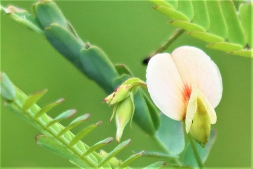 湿地に足を運ぶと、クサネムの小さな花が咲いていました。稲作につきものの水田雑草で、稲よりも成長する大型雑草なため、収穫時に種子の混入により米の品質低下をもたらす雑草として嫌われています。ただし、地域によっては希少植物に指定されるなど、複雑な立場にたたされている植物です。