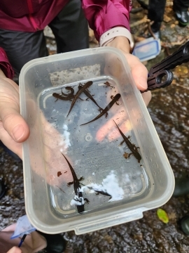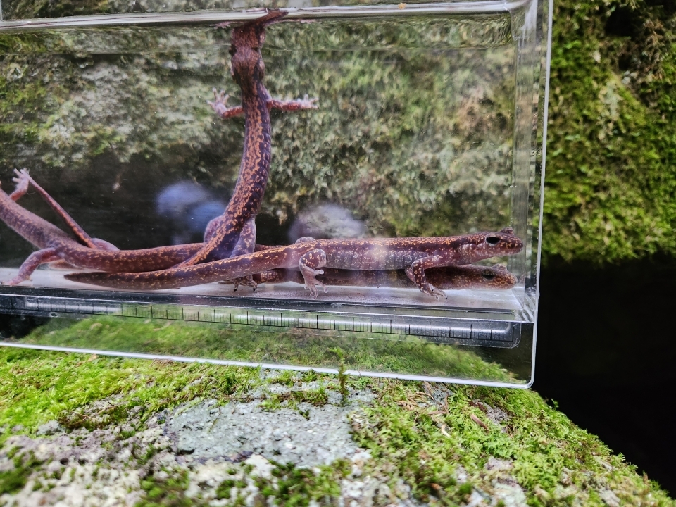 ハコネサンショウウオは成体でも全長15cmほどで渓流等の水の流れがある場所に生息しています。近年ではDNAを調べて種の同定を行うようになり、ハコネサンショウウオと一口に言っても様々な種類がいることがわかってきました。