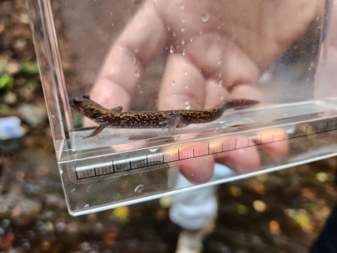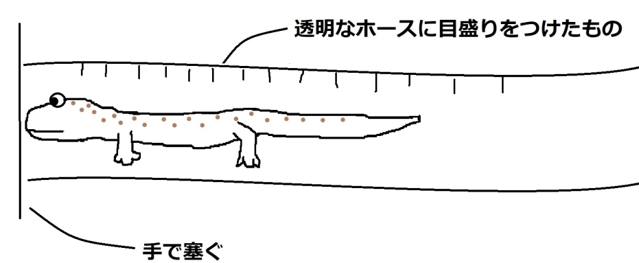捕まえたサンショウウオを目盛りのついた透明なホースに入れて、どのくらいの大きさなのか測定し、幼体が多いのか、成体が多いのか、雄と雌どっちなのか等も記録していきます。こうして記録を残していくことで生態が変化した時に気づくことができます。