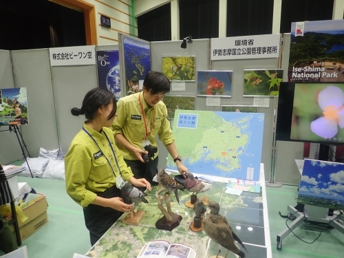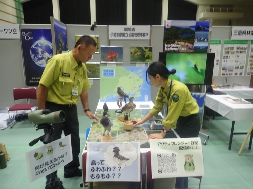 私たちのブースでは、三好ARの素敵な写真が流れる映像をバックに、身近な鳥の剥製に触れる体験をしながら、伊勢志摩国立公園MAPを使い、伊勢志摩国立公園の紹介や身近な自然の魅力を発信させて頂きました。