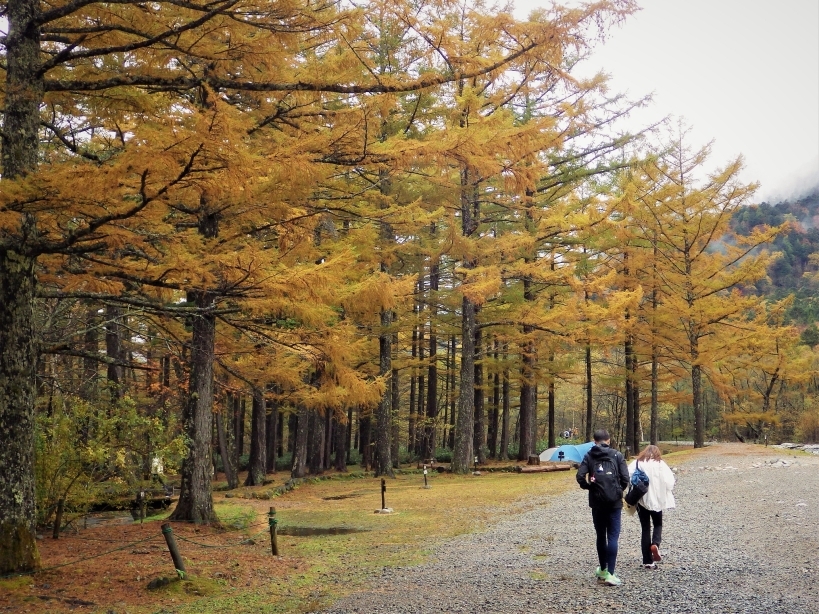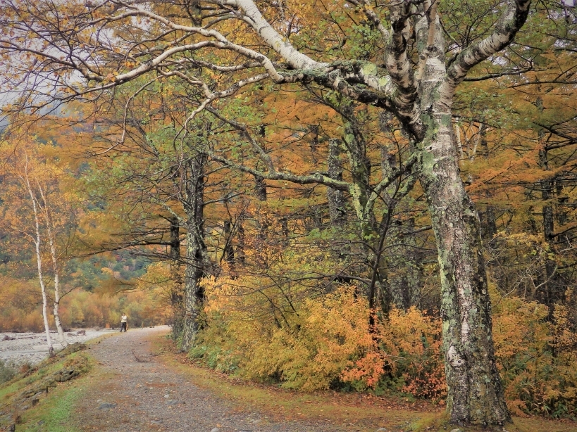 今なら、上高地ビジターセンター前では、例年はとっくに散っているハルニレの黄葉も楽しめますよ。