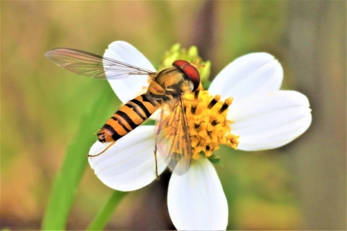 食事に夢中なのか、無警戒に後ろ姿を見せているのはホソヒラタアブです。空中で静止するホバリングが得意で、幼虫はアブラムシを食べ、成虫は花粉などを媒介することから、益虫として扱われています。小さいのはよく飛んでいますが、この子は比較的大型でした。