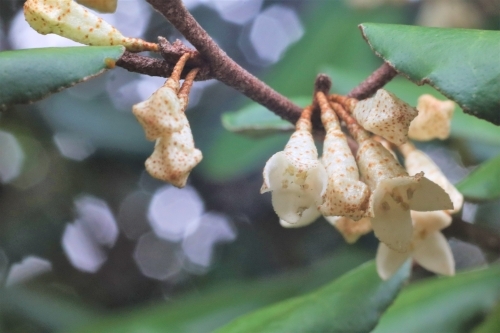 山林に入ると、ナワシログミの花が満開に咲いていました。グミ科グミ属の常緑低木で、10月下旬から11月上旬に花期を迎え、翌年の初夏に赤い実が熟します。苗代を作る5月下旬ごろに実が熟すことが和名の由来だそうです。地域によっては希少な植物です。