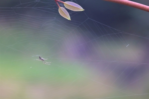 山間を歩いていると、きらきら光るクモの巣を発見!近づくと小さなクサグモがモゾモゾと動いていました。四方に張り巡らされたクモの糸は本当にきれいで、こんな小さな空間にも自然の不思議さを感じさせてくれます。