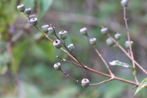 ウツギは、ユキノシタ科の落葉低木で日本固有種です。枝を切ると幹の中心が空洞になっていることから「空木(うつぎ)」と呼ばれているそうで、卯月(現在の5月)のころに白い花を咲かせるため、その名が付いたとも言われています。球形の実は木質で、小さなコマのような形をしています。渋い色合いがいい感じです。