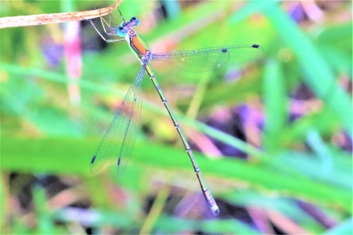 湿地へ行くと、オオアオイトトンボが翅を休めていました。この時期に出会えるトンボはどんどん少なくなってきており、この子を見たときには感激しました。アオイトトンボとの違いは、腹部ラインや腹端部で見分けられます。地域によっては希少なトンボです。本当にきれいですね!