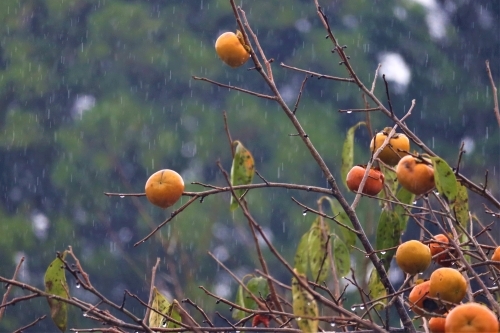 雨が降りしきるなか、「ザ・日本の秋」とも呼べるカキノキの登場です。学術上の植物名はカキノキで、その果実をカキと呼ぶそうです。「桃栗三年柿八年」という言い伝えがありますが、それぞれの木の種から芽が出て実になるまでの月日を指します。その裏には「何事も成し遂げるまでには相応の年月が必要だ」という意味だそうです。勉強になりました。
