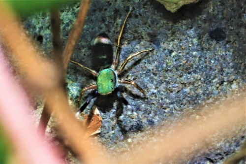 海岸近くで目線を落とすと、緑色をした小さな生き物が足早に歩いています。ファインダーを通してその姿を追っかけると、アオオビハエトリと目が合いました。「なにか用?」と話し掛けられているようで、こちらが萎縮してしまいます。