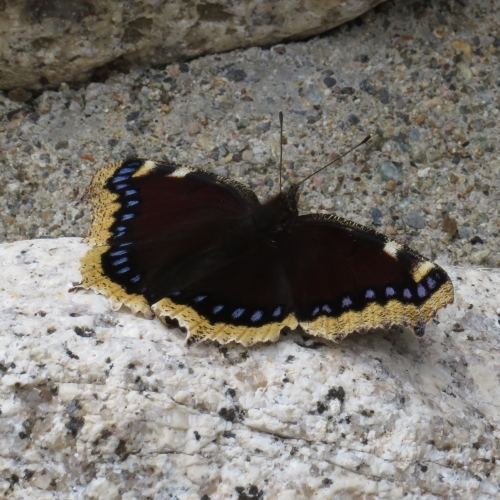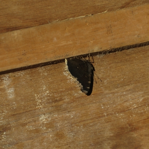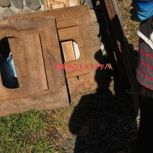 先日、この作業のために屋外で保管していた木板を移動させたところ、板の裏側に、越冬中のキベリタテハというチョウがぶら下がっていたのです。この越冬中のキベリ君は、当初板を動かしても、手で触っても全く反応がありませんでした。ですが、そのまま陽の当たる場所に置いておくと、やがて体温が上がって少しずつ動き始め、一の瀬の空に飛び立っていきました。ちょっと申し訳ないことをしましたが、越冬中のチョウは自然の状態でも冬の暖かい日に目覚めて飛び出すことがよくあるので、気温が下がれば、またどこか良い場所に潜り込んで越冬を再開するのだと思います。