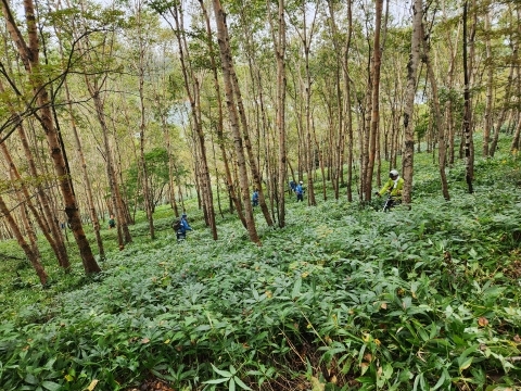 野反湖周辺にはもともとシラネアオイが群生していましたが、数が減り、平成8年頃から地元の方々で植栽を始めたそうです。平成30年まで植栽は続けられ、今は保全のため、笹刈りが実施されています。植栽をしていた頃から地元の六合中学校の生徒も協力してくれており、今回も手鎌で笹刈りを手伝ってくれました。