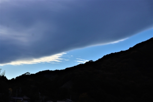 南伊勢町へ行った際、雲行きが怪しくなってきました。分厚い雲が山を覆い被さるように垂れ込み始め、その中に一筋の光り輝く雲が流れて行きます。隙間に見える青空とのコントラストがいい感じです!