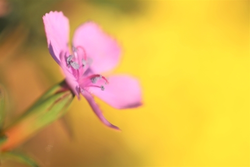 一輪のハマナデシコの華麗な花を際立たせてくれるのは、アゼトウナの黄色い群生です。開放露出でマクロの世界を覗くと、時に驚くような色彩を発見することがあります。自然界の凄さです。ハマナデシコは、ナデシコ科ナデシコ属の多年草で、本州から沖縄および中国に分布します。花期は6月~11月で、海岸や砂地に自生し、今が最後の時期だと思います。ただ、温度の変化への適応力が強く、0℃の寒さにも、38℃の暑さにも耐えられるそうです。京都府では絶滅危惧種に指定されています。