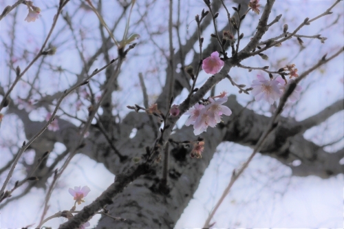 フユザクラはこの季節に花を咲かせてくれます。本州を原産とするバラ属の落葉高木で、諸説はありますが、ヤマザクラとマメザクラが自然交配してできたものとされています。伊豆半島と房総半島には自生種も見られるそうです。11月~12月と4月の年2回開花時期があり、その間も細々と咲き続けるそうです。