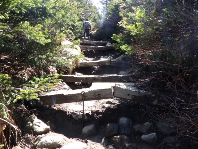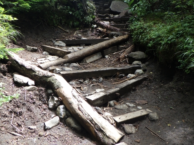 下の写真は、黒斑山の登山道の一部です。木の棒が地面ではなく空中を渡り、ハードルのようになっています。この階段は2017年に直されましたが、7年経過する間に、雨で水が流れ、少しずつ地面を掘っていったのでしょう。すると、通るためには足を上げ、跨ぐ必要のある、歩きにくく不便な道へと変わってしまいました。