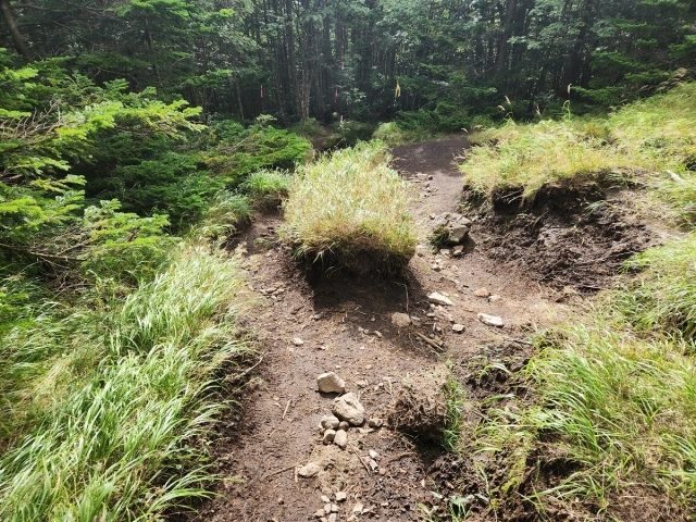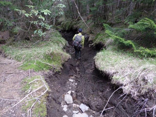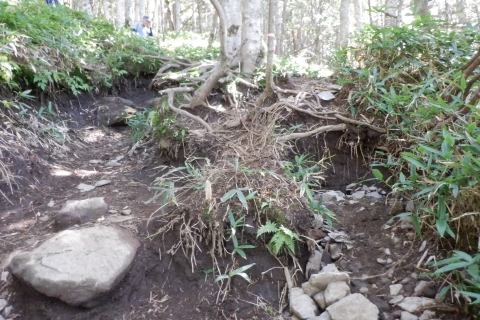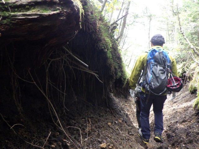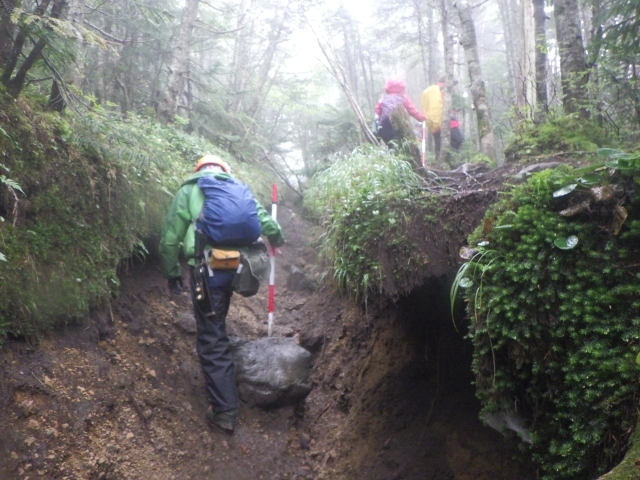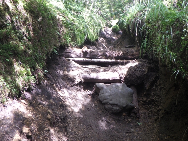 ここは人が歩いて植物がなくなったところに、水が集まって登山道沿いを流れ、地面をどんどん掘っていったと思われます。そして、V字に切れ込んだ地形となり、さらに深く深く掘られていきます。V字に切れ込んだ地面の側面は植物が生育するには角度が急すぎるためか、植物が育たず、地面が剥き出しで横方向にも水による浸食が進みやすい状態となります。
