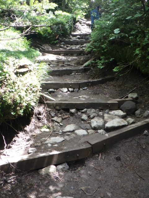 このままでは山が崩れていくばかりか、登山者にも危険な状態ですので、階段を夏前に修繕をしました。