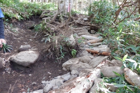 近自然工法で整備した登山道は、歩きにくい道になるのかと言ったらそうではありません。歩きにくいと、登山道から外れる人が出て山へダメージを与えてしまいます。そうならないように、人がどう歩くかを考えながら、自然と歩いてほしい道へ誘導するように整備するので、結果的に歩きやすい道にもなります。