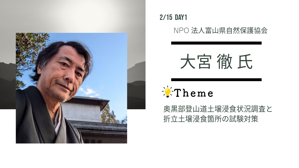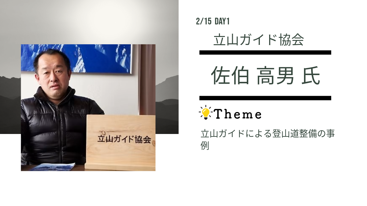 ご存じですか?立山ガイド協会の佐伯高男氏が、立山周辺での登山道整備について事例紹介を行います!特に富山県では学校登山(林間学校)でも使用する立山登山でも通る「一ノ越~雄山区間」での整備の実例を中心に、ガイドだからこそできる独自のアプローチをご共有いただきます。登山者が安全に歩ける道を守るだけでなく、その背景にある技術や人材育成についてもお話しいただきます!