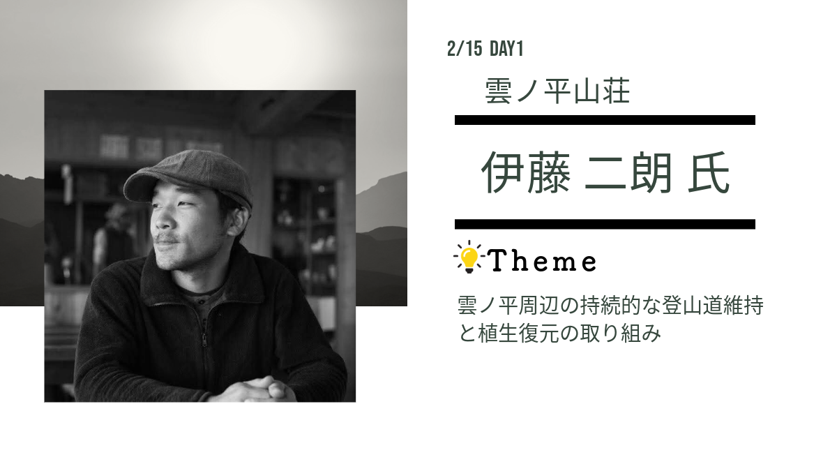 「最後の秘境」とも称される北アルプスの最奥部に位置する雲ノ平。その溶岩台地からなる美しい高山帯で、登山道周辺の荒廃が生じており、植生の復元や持続的な登山道の管理に対する課題に向き合われています。日本の国立公園のあるべき姿を提唱している伊藤氏にご登壇いただきます!