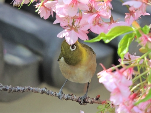 志摩市大王町にあるアジサイで有名なお寺さんへ行ってきました。カワヅザクラがピークを少し過ぎた時期でしたが、まだまだきれいに咲いています。そこにはたくさんのメジロが戯れており、あちこちをせわしなく飛び回っていました。この子は食事中で、サクラの花に夢中です。スズメ目メジロ科メジロ属の鳥類で、全長約12㎝。雑食ですが、花の蜜や果実を好んで食べます。睡眠時は、群れ全体でかたまって枝に留まる習性があるそうです。「チー、チー」と地鳴きしてかわいいです。