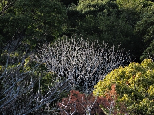 横山園地(志摩市)では、この季節に山々を見渡すと、詫び錆びの世界のような色彩を楽しめます。冬の名残でしょうか。色彩に華やかさは薄いものの、光を浴びて輝く木立がとても魅力的です。