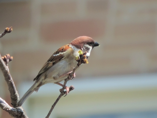 志摩市内のサクラの木には、スズメがつぼみをついばんでいます。スズメは人里が大好きで、軒下や瓦の下などに巣を作ります。スズメ目スズメ科スズメ属に分類される鳥類で、全長約14㎝。「チュン、チュン」と鳴きます。昭和末期以降、減少傾向にあると言われており、特に都市部の個体群の減少が著しいそうです。一年あたり3.6%減少していたというデータもあるそうですよ。