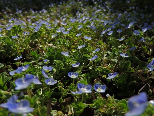 志摩市内の国道沿いには、オオイヌノフグリが満開に咲いています。シソ目オオバコ科クワガタソウ属の越年草で、早春に多数の花をつけ、春の終わりには枯れてしまいます。日本には明治初年に入ってきたと推定され、明治17年あるいは明治20年に東京で見られてから急速に拡大したそうです。群生している姿は幻想的できれいです。