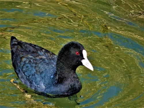 志摩市内の川辺には、オオバンが優雅に泳いでいます。ツル目クイナ科オオバン属に分類される鳥類で、全長約39㎝。北海道、本州、九州の一部で繁殖し、本州以南では留鳥または冬鳥として分布します。雑食ですが基本的には草食で、潜水や倒立をして水中のものも採食します。「キュキュー」などと高い声で鳴きます。